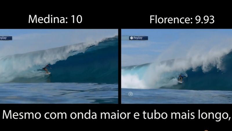 A onda do Medina é maior e ele ficou um pouco mais no tubo (algo como 1/3 de segundo). Entretanto, os juízes deram apenas 0.07 a mais para Medina.