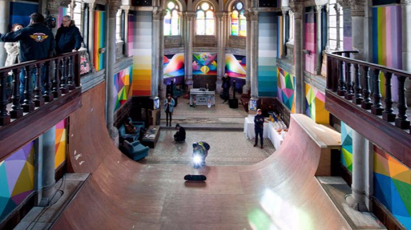 Fundada em 1912 e com o projeto do arquiteto Manuel Del Busto, a bela Igreja de Santa Barbara, Espanha, encontrava-se abandonada. Entretando, um grupo de Skatistas resolveram restaurá-la e com ajuda da Red Bull e fundos capitados online, conseguiram contruir um Skate Park dentro dela! Bela iniciativa!