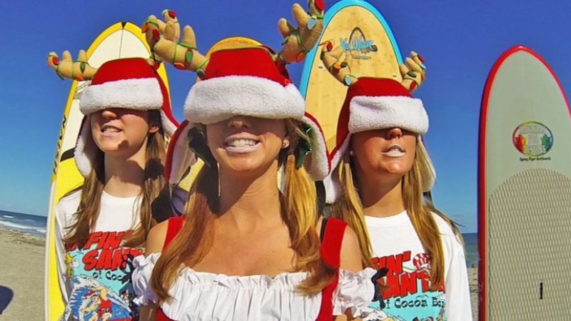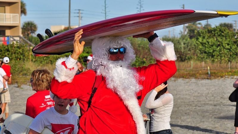 O Surfin Santas evoluiu para um encontro anual das tribos do surf na Flórida. No último ano 300 surfistas apareceram pra surfar com roupa de Papai Noél.