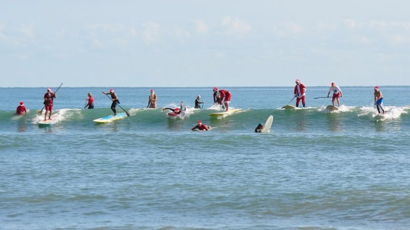 Imagine 300 Papais Noéis surfando no mesmo pico