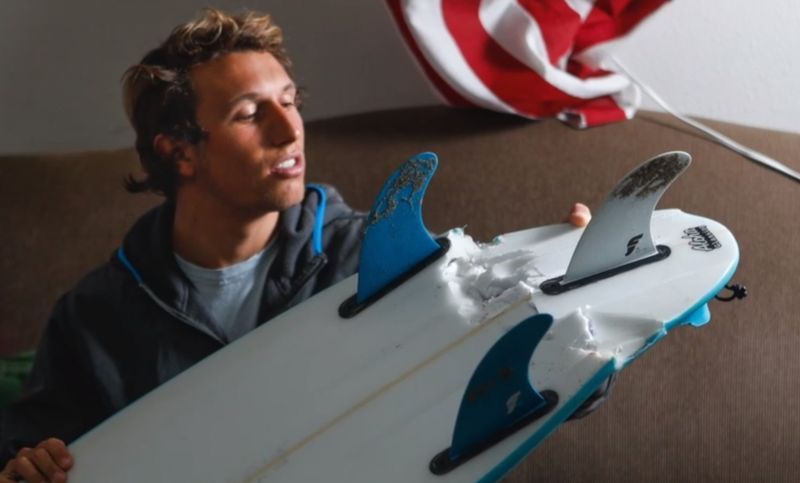 Sua prancha foi destruída, mas o surfista passa bem.
