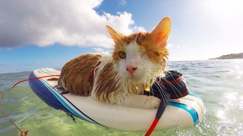 Uma das sensações da internet é o gatinho pirata só que não ficou famoso por sua deficiência, mas pelo fato inusitado de pegar onda com suas donas Alexandra Gomez e Krista Littleton no Hawaii.