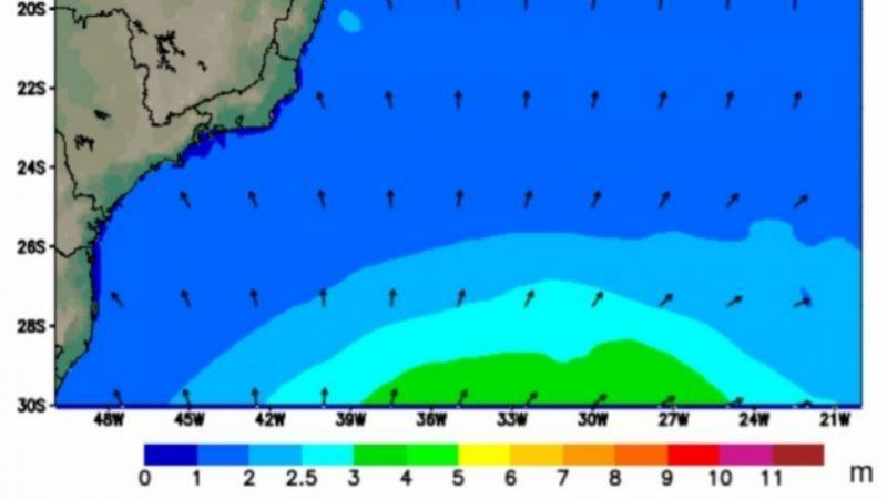 Mar crescendo no fim de tarde de sexta feira (12) e mantendo ondas entre 1,8m a 2,1m com período entre 10 e 12s durante o final de semana. Direção Sudeste.