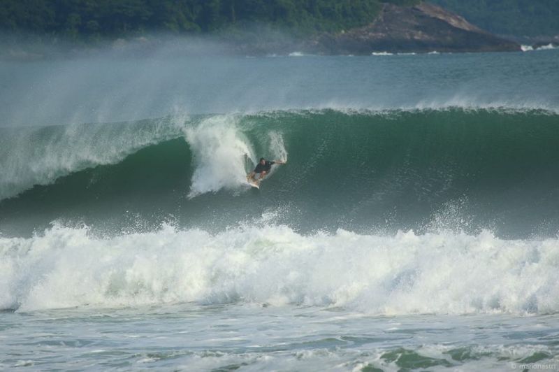 O surfista e parceiro Thiago Camarão mostrando como ele confere as condições das ondas pelo litoral paulista.