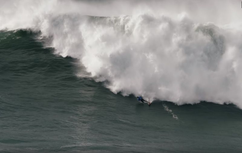 Jacaré surfou a primeira onda da série no swell monstruoso que atingiu a praia do Norte, Nazaré, em Portugal.